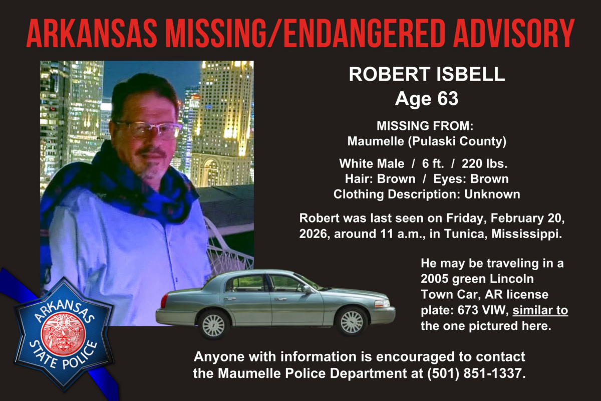 He may be traveling in a 2005 green Lincoln Town Car with Arkansas license plate 673 VIW.